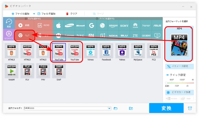画面の右側にある形式アイコンをクリックして、「ウェブ」タブに移動して、「YouTube MP4」、または「YouTube WebM」を選択します。