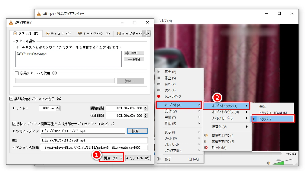 再生の画面で右クリックして、「オーディオ」>「オーディオトラック」>「トラック2」の手順にクリックすると、VLCで動画と音声を結合することが完成しました。