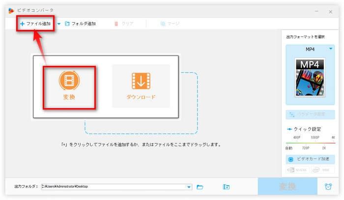 「+ファイル追加」をクリックして、コーデックを変換したい動画を追加します。もしくは、直接にソフトにドラッグアンドドロップします。