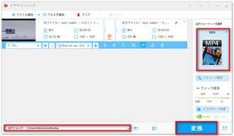 画面右の形式アイコンをクリックして出力形式リストを開きます。MP4、MOV、AVIなどの出力形式を選択することができます。画面下の出力フォルダ欄で動画の保存先を設定します。最後に、「変換」をクリックして、動画を出力します。動画の長さや解像度によっては、出力に時間がかかることがあります。