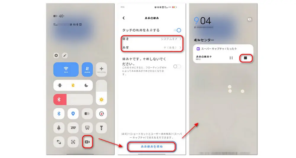 1、クイック設定パネルを開いて、スクリーンレコードを長押しして、録画の設定を行います。