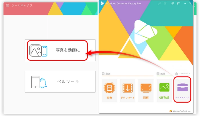 「ツールボックス」>「写真を動画に」の手順をクリックして、「写真を動画に」画面を開きます。