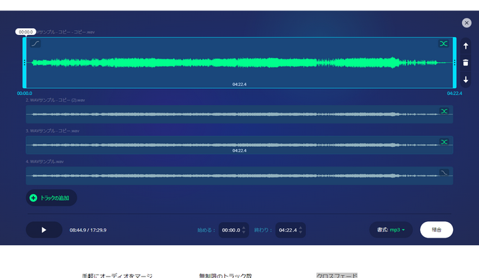 ソフトをインストールしたくない場合は音声結合サイトを利用してループBGMを作成することもできます。ここではAudio Joinerというサイトをおすすめします。単に短い音源を結合してループBGMを作成できるだけでなく、音源をクロスフェードにしてつなぎ目を自然にすることもできます。300以上の音声形式の読み込みに対応し、作成したループBGMをWAVまたはFLAC、MP3、M4A形式で書き出すことができます。