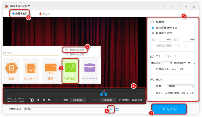 「WonderFox HD Video Converter Factory Pro」は動画変換やダウンロードだけでなく、GIF(動くバナー・アニメーションバナー)を作る機能も備えた多機能ソフトです。このソフトを使えば、動画や連続写真から簡単にGIFバナーを作ることができます。フレームレートや解像度、出力品質を自由に調整することで、GIFバナーのサイズや速度を自分の好みに合わせて変更できます(プレビュー機能がある)。動画からGIFバナーを作る場合、動画の長さや開始・終了時間を指定することにより、一部分を切り出してGIFに変換できます。連続写真からGIFバナーを作る場合、写真を順番に追加してから間隔、品質、解像度を設定できます。独自のエンコード技術により、出力速度が劇的に向上します。また、YouTubeや他のサイトから動画をダウンロードしたり、パソコンの画面を録画したりした後、その動画をGIFバナーに作ることもサポートします。
