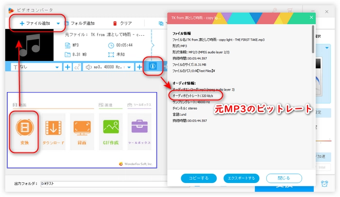 ファイルを読み込まれたら、ツールバーにある「i」のようなアイコンをクリックすれば元MP3ファイルのビットレートなどの情報を確認できます。