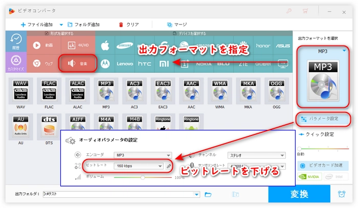 そして、「パラメータ設定」をクリックします。「オーディオパラメータの設定」セクションで「ビットレート」を元より低い値に指定すればいいです。また、必要に応じてボリュームやサンプリングレートなどを変更することもできます。