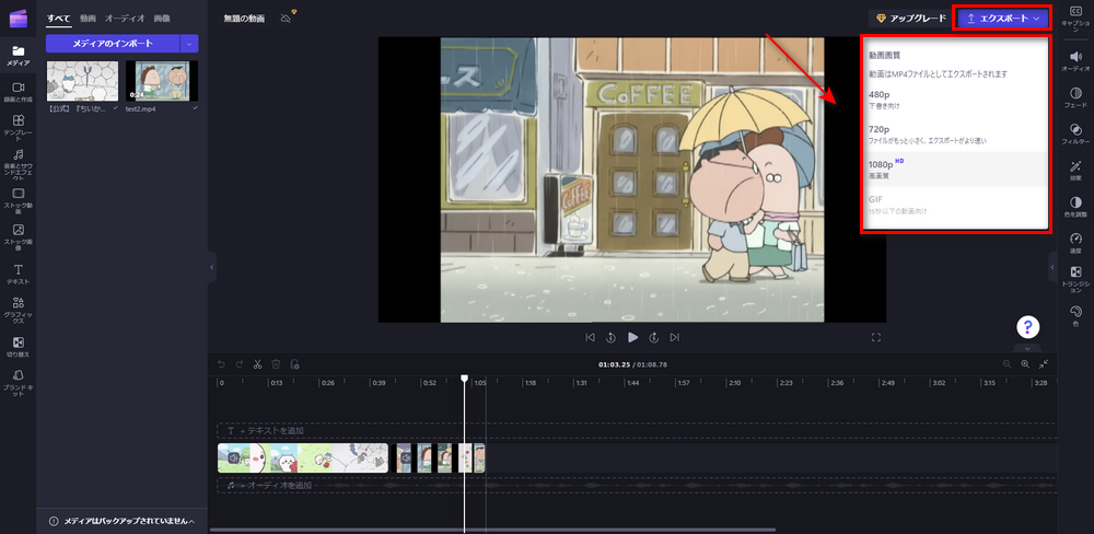 ステップ3、上記の操作が完成したら、続いて結合した動画を出力します。まず、右上の「エクスポート」ボタンをクリックします。そして、出力動画の画質を選択します。1080pの解像度を選択することをおすすめします。出力動画の画質を選択してクリックすると、結合した動画が自動的に出力されます。