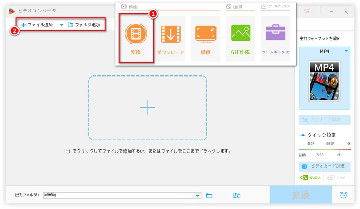 右側の「出力フォーマットを選択」下の形式ボタンをクリックし、「動画」カテゴリで「MP4」を出力形式として選択します。