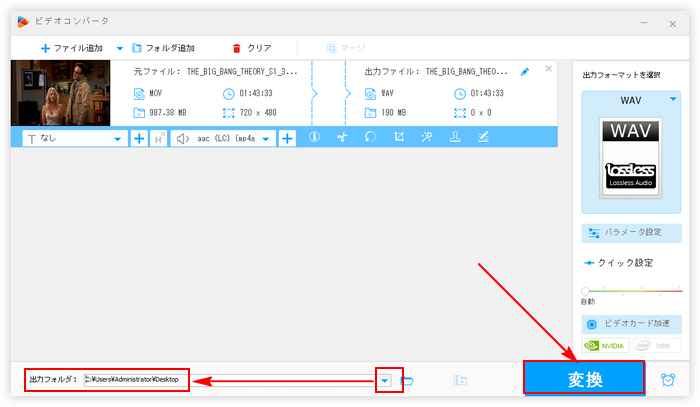 出力フォルダ欄の「▼」アイコンをクリックしてWAVファイルを保存するためのフォルダを設定します。最後に「変換」ボタンをクリックし、WonderFox Free HD Video Converter Factoryを使ってMOVから音声を抽出してWAVに変換します。