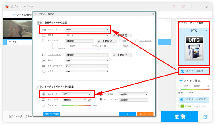 次に「パラメータ設定」ボタンをクリックしてパラメータ設定画面を開きます。「オーディオパラメータの設定」セクションに移動して「エンコーダ」のドロップダウンリストからMP3またはAACを選択します。また、画質が変わらないように、上の動画エンコーダもH264に設定しておきましょう。