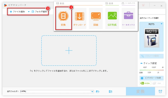 TS/MTS/M2T M2TS変換ソフトHD Video Converter Factory Proを立ち上げて、メイン画面で「変換」をクリックします。変換画面の左上にある「ファイル追加」・真ん中にある「+」をクリックしてTS/MTS/M2T動画を選択し追加するか、TS/MTS/M2T動画を変換画面に直接にドラッグして追加します。