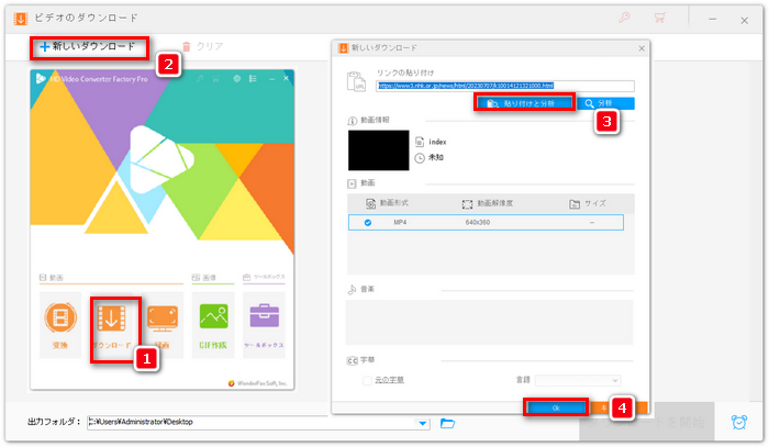 動画ダウンロードソフトWonderFox HD Video Converter Factory Proを立ち上げて、メイン画面で「ダウンロード」をクリックします。そして、「新しいダウンロード」をクリックして、コピーした動画ニュースのURLをボックスに貼り付けて分析します。分析が終わったら、分析結果が表示されます。最後に、「OK」をクリックします。