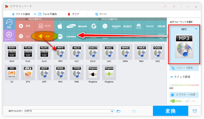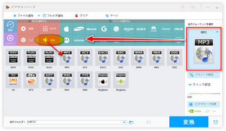 ソフト右側のアイコンをクリックして、出力フォーマットリストの「音楽」タブで「MP3」をクリックします。