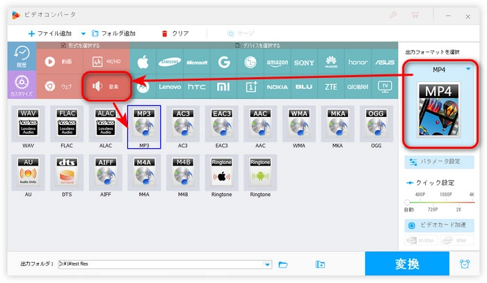 右側の形式アイコンをクリックして、「音楽」タブから音声形式を選択します。