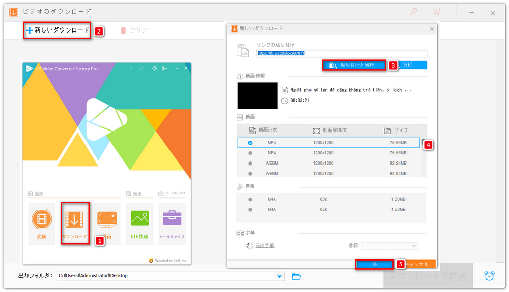 ステップ2、WonderFox HD Video Converter Factory Proを立ち上げます。メイン画面で「ダウンロード」機能を選択して、「新しいダウンロード」をクリックします。そして、コピーしたFacebook動画のリンクをURL入力欄に貼り付けて分析します。分析が完了したら、必要に応じて分析結果から動画の形式、解像度、サイズを選択します。その後、「OK」をクリックします。