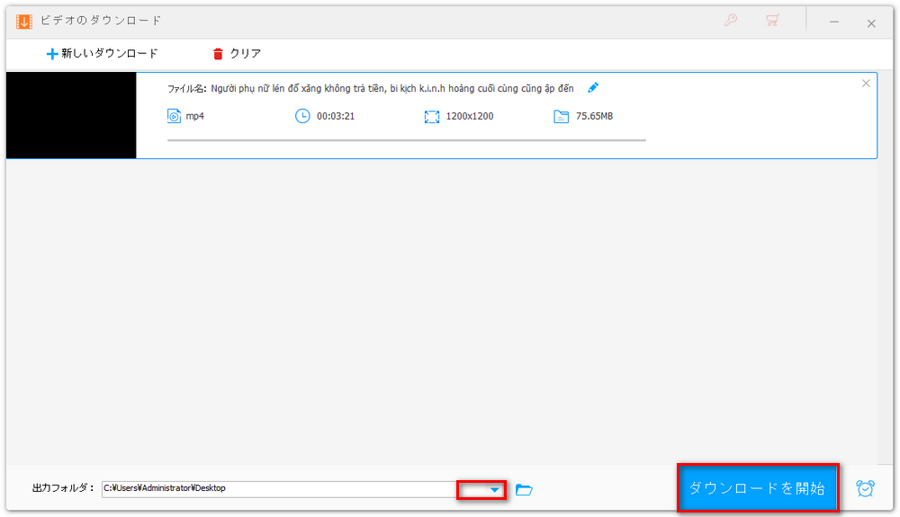 ステップ3、画面下部の「▼」ボタンをクリックして動画の出力先を設定します。最後に、「ダウンロードを開始」をクリックすると、Facebook動画のダウンロードが始まります。