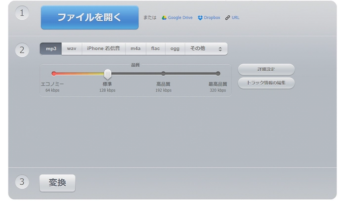 Convertioはとても人気があるオンライン変換ツールです。FLAC、MP3、WAV、AACなどの形式を変換するほか、コーデック、ビットレート、音量などを変更することも可能です。ご注意するのは最大追加できるファイルサイズは100MBです。