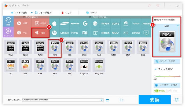WonderFox HD Video Converter Factory Proは、Windows OS向けの強力なMP3再エンコードソフトです。iPhoneで再生できないほとんどのMP3ファイルを、わずか3ステップで再エンコードできます。独自のオーディオ解読/圧縮技術により、音質劣化を最小限に抑え、エンコード速度を最大化できます。バッチエンコードに対応し、ファイル情報をもとにパラメータを知的に設定できるため、エンコード効率を大幅に向上させることができます。また、MP3のビットレート/サンプリングレート/チャンネル/ボリュームの変更や分割/結合のほか、動画・音楽ダウンロード/着メロ作成/動画からの音声抽出/録音/音声ファイルのサイズ変更などの機能も備えています。iPhoneでMP3ファイルが再生できない問題に遭遇し、どうしたらいいかわからないとき、このソフトを使ってMP3を再エンコードしてみるのも悪くないと思います。