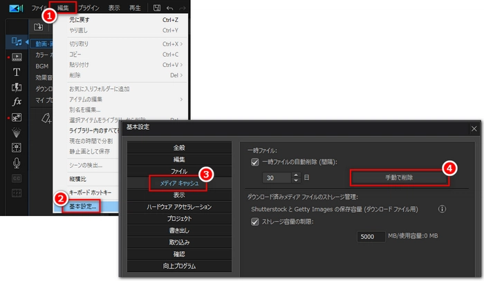 ・「編集」>「基本設定」>「メディア キャッシュ」>「手動で削除」をクリックし、余分なキャッシュを削除します。