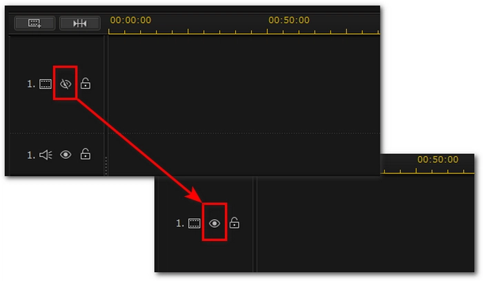 ・動画トラックの先頭にある目のアイコンがオンになっていることを確認します。オフになっている場合は、目のアイコンをクリックして動画トラックを有効にします。