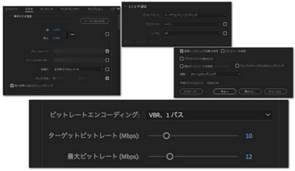 次、下の「ビデオ」パネルで、必要な動画パラメータを細かく調整します。例えば、「最大深度に合わせてレンダリング」にチェックを入れ、「プロファイル(レベル)」を調整し、「ビットレートエンコーディング」「ターゲットビットレート」「最大ビットレート」などを動画素材の品質や得たい効果によって調整します。ちなみに、通常、「VBR、2 パス」を選択してからビットレートが高いほど画質が高くなりますが、書き出す動画のファイルサイズも大きくなります。