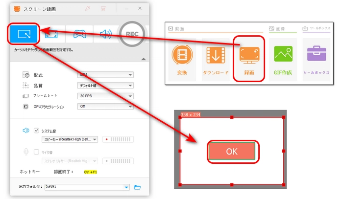 ステップ3.右上の「+録画範囲を選択」をクリックして、マウスをドラッグして録画範囲を決めます。