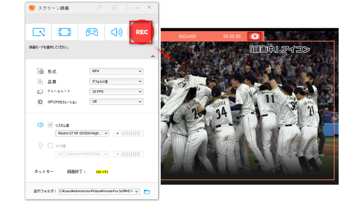 録画を終了するには、「Ctrl」+「F1」キーを押すか、「録画中」アイコンをクリックしてください。