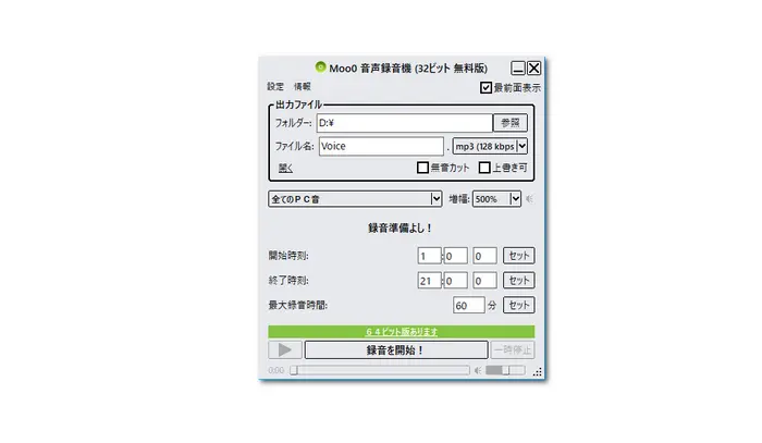ヒント:「開く」をクリックすれば、指定したフォルダーにある録音したファイルを確認できます。「無言カット」という機能で無言部分を自動的にカットできます。ちなみに、「設定」で無言カットに関する詳細な内容について設定できます。「増幅」機能で録音の音量を変更できます。「設定」で「開始時刻」、「終了時刻」、「最大録音時間」などを設定できます。
