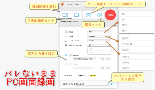 システムサウンドのみ録音:マイク音声を録音すると、キーボード音や周囲の雑音から録音していることがバレる可能性があります。システムサウンドだけを録音する設定にしましょう。
