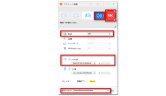 画面上部で「音声録音モード」を選択します。次に、「形式」のドロップダウンリストから録音形式を選択します。テキスト読み上げの音声を録音するには、「システム音」にチェックが入っていることが必要です。画面下の「▼」をクリックして、ファイルの保存先を指定してください。
