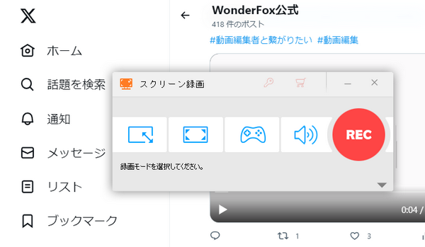 画面トップのアイコンをクリックして録画モードを選択します。一つ目はウィンドウモードでパソコンのウィンドウを録画できるほか、任意の範囲を指定して録画することもできます。二つ目は全画面モードでパソコンのスクリーン全体を録画します。三つ目と四つ目はゲーム録画モードと録音モードになります。Xの動画をフルスクリーンで再生し、全画面モードで録画することをおすすめします。