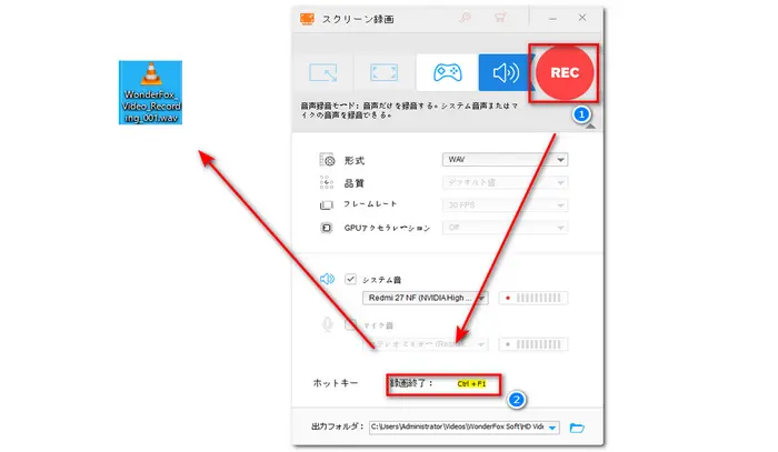 画面右上側にある赤い「REC」アイコンをクリックすることで、WAV形式で録音し始めます。録音が終わったら、「Ctrl」+「F1」を同時に押せば、録音を停止できます。