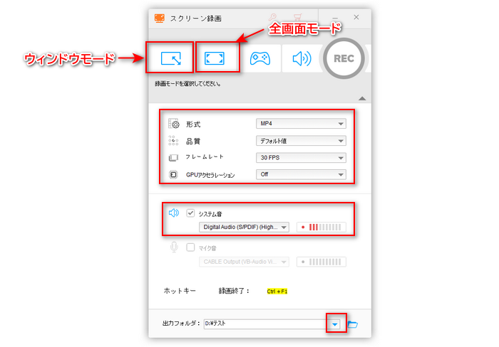 画面録画の際、パソコン以外の音を収録したくないなら、「システム音」にチェックを入れ、「マイク音」のチェックを外します。