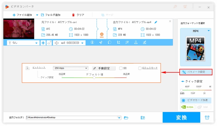 「パラメータ変更」をクリックして新しい画面を開きます。この画面ではエンコーダ、ビットレート、フレームレート、サンプリングレート等の動画/音声パラメータを変更できます。「ビットレート」のドロップダウンリストから低いビットレートを選択すれば動画の画質を悪くすることができます。また、「手動設定」をクリックして手動で低いビットレートを入力することもサポートします。さらに、「VBR」のチェックを入れてから「クイック設定」のスライダを「低品質」までにドラッグすることによって動画の画質を悪くすることもできます。「Ok」をクリックして「ビデオコンバータ」画面に戻りますと、動画はサイズも小さくなっていることがわかります。