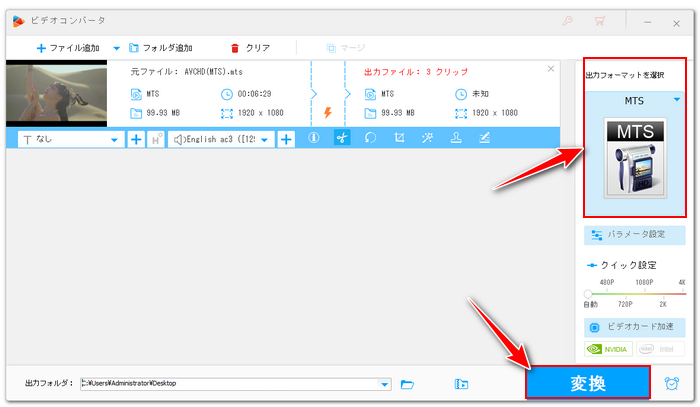 Step6、「▼」アイコンをクリックしてクリップの出力先を設定してから「変換」ボタンをクリックし、分割したクリップを一旦書き出します。