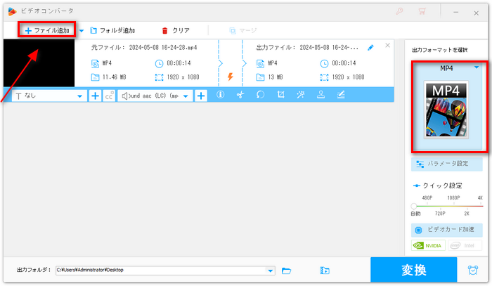 WonderFox HD Video Converter Factory Proを起動して、メイン画面で「変換」をクリックします。そして、「ファイル追加」または画面中央の「+」をクリックして、動画をソフトに追加します。次に、画面右にある形式アイコンをクリックして、動画の出力形式を選択します。