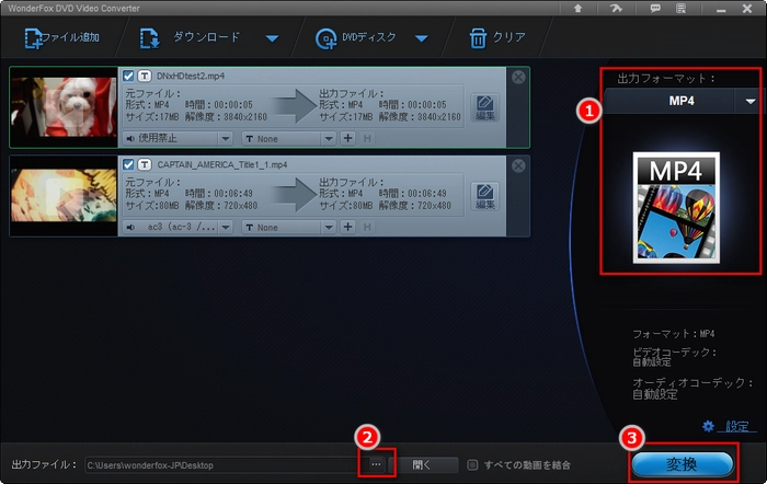 ③右側の「出力フォーマット」ボタンをクリックし、必要に応じて動画ファイルの出力形式を選択します。