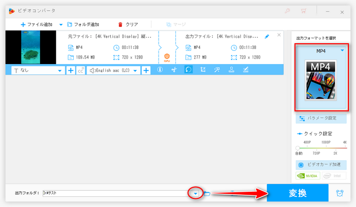 下部で出力フォルダを指定してから、「変換」をクリックして回転・反転された動画をパソコンに書き出して保存します。