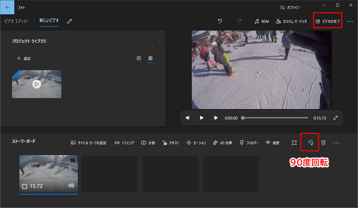 ご注意:新しいバージョンの「フォト」には「ビデオエディター」ツールが搭載されなくなりました。その場合、「フォト レガシ」を入手してください。詳しくは:Windows11/10のフォトにビデオ エディターがない?解決策と代替ソフトを紹介!