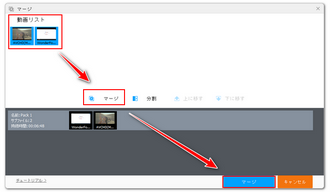 Step4、画面トップにある「マージ」ボタンをクリックして結合編集画面を開きます。そしてオープニングと本編動画を選択した状態で画面中央にある「マージ」をクリックし、結合パックを作成します。パック内でオープニングは本編動画の前にある必要があります。順が間違っている場合はクリップをドラッグしてその順を調整できます。最後は下の青い「マージ」ボタンをクリックし、編集内容を保存します。