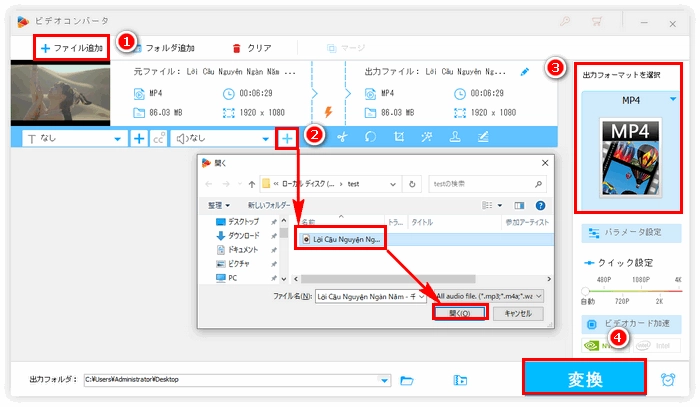 ①同じく「ビデオコンバータ」画面で「ファイル追加」ボタンをクリックし、まずMP4の映像を読み込みます。