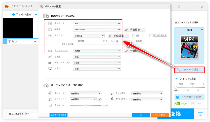 ④「パラメータ設定」ボタンをクリックして新しい画面を開きます。ここで動画のデータ量を影響する解像度やフレームレート、ビットレートなどを下げることで動画のファイルサイズを圧縮することができます。また、動画のエンコーダを圧縮率がより高いもの、例えばAV1に変換することで無劣化で動画の容量を縮小することができます。パラメータ調整後は下の「Ok」をクリックして変換画面に戻ります。出力のファイルサイズが4GB以下であることを確認します。