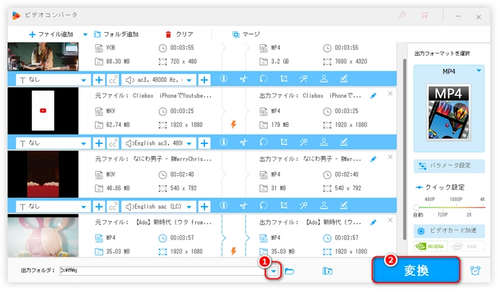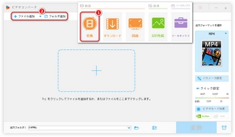 左上の「+ファイル追加」ボタンをクリックし、動画を選択してソフトに追加します(複数の動画を一括追加可能)。