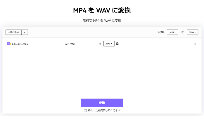 ソフトを実行し、「ファイルを追加」ボタンをクリックして音楽に変換したい動画ファイルを選択して読み込む >> 「開く」をクリックして音楽ファイルの保存先を設定 >> 「変換後のフォーマット」ドロップダウンリストから必要な音楽形式を選択 >> 「変換する」ボタンをクリックし、PCで動画ファイルをMP3など音楽ファイルに変換する。