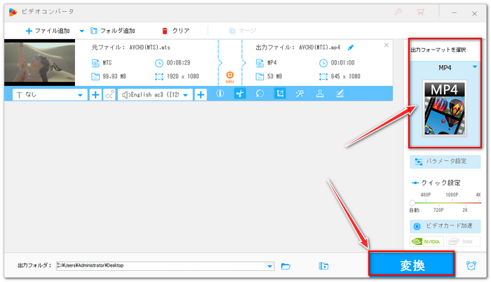 画面右側の形式アイコンをクリックして出力形式リストを開き、「動画」カテゴリからMP4など必要な形式を選択します。