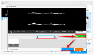 タイムラインにある二つの青いスライダーをドラッグして残したい部分を選択し、緑の「切り取り」ボタンをクリックすれば音声クリップを作成できます。これで音声をカット編集できます。複数のクリップを作成して出力すれば、音声ファイルを分割することになります。最後に下の「Ok」をクリックして音声クリップを保存してください。