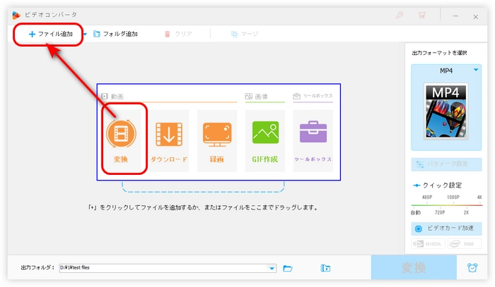 「+ファイル追加」または「+フォルダ追加」をクリックして、音声が出ないWebMファイルをソフトにインポートします。