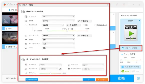 「パラメータ設定」をクリックしてニーズに応じてエンコーダ変更、チャンネル変更、ビットレート調整、サンプリングレート調整、ボリューム増減などができます。「Ok」をクリックして変更を保存します。その他、音声をカットしたり、結合したりすることもできます。