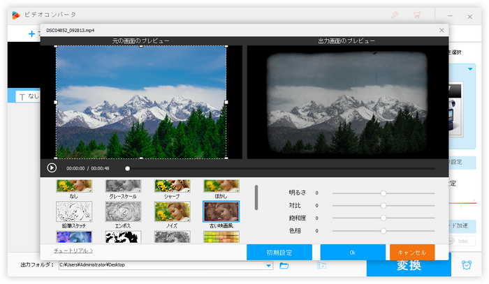 左側のアイコンをクリックして動画に様々なフィルターをかけることができます。右側の四つのスライダーをドラッグして動画の明るさ、対比、飽和度、色相を調整できます。