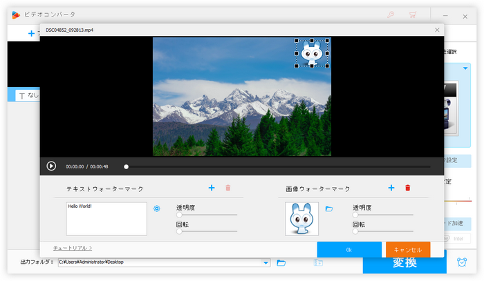 左側の入力ボックスに文字を入力して動画に文字透かしを入れることができます。右側のフォルダアイコンをクリックして「画像追加」を選択すれば動画に画像透かしを追加できます。また、透かしの透明度や位置、サイズなどは自由に調整できます。